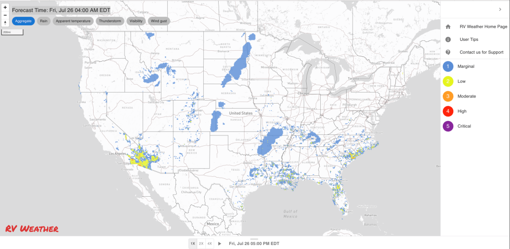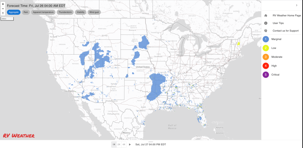These are the most significant weather impacts to RV travel over the next two to three days. I do not list every area of rain, showers, or breezy winds. It would be exhausting (for both of us!).