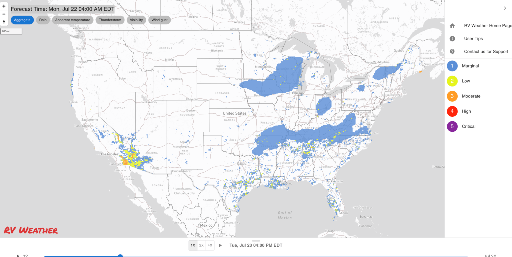 These are the most significant weather impacts to RV travel over the next two to three days. I do not list every area of rain, showers, or breezy winds. It would be exhausting (for both of us!).