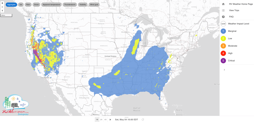 These are the most significant weather impacts to RV travel over the next two to three days. I do not list every area of rain, showers, or breezy winds. It would be exhausting (for both of us!). Please check out the animations and graphics (included) or WILMA (subscription required) for a good depiction of the weather along your route.