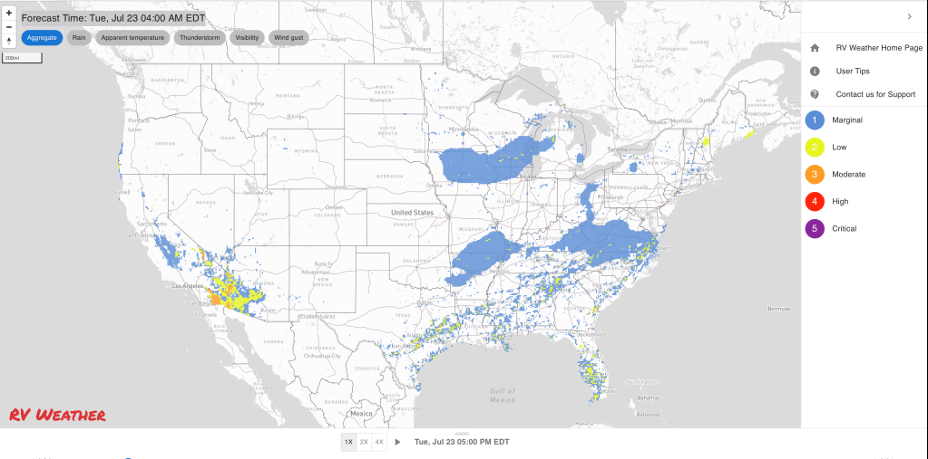 These are the most significant weather impacts to RV travel over the next two to three days. I do not list every area of rain, showers, or breezy winds. It would be exhausting (for both of us!).