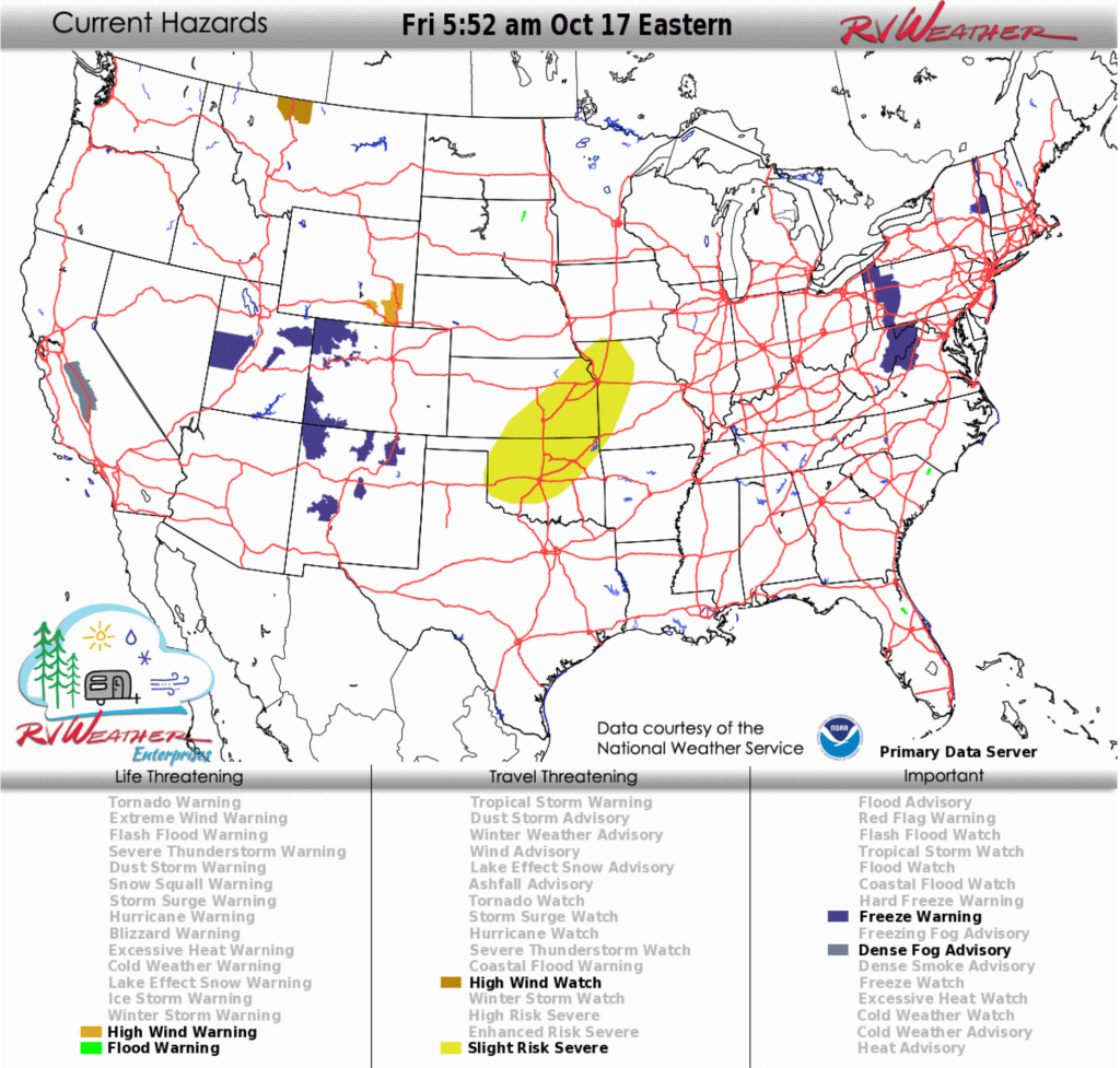 These are the most significant weather impacts to RV travel over the next two to three days. I do not list every area of rain, showers, or breezy winds. It would be exhausting.