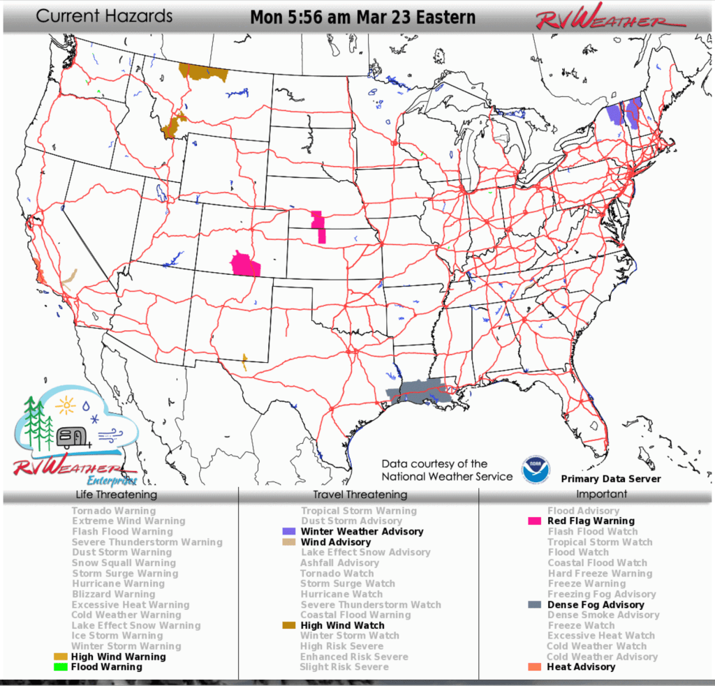 Here are the relevant National Weather Service Warnings, Watches and Advisories that will impact RV and Road travel over the next several days.