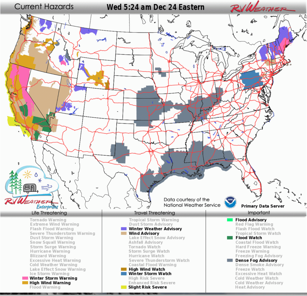 Here are the relevant National Weather Service Warnings, Watches and Advisories that will impact RV and Road travel over the next several days.